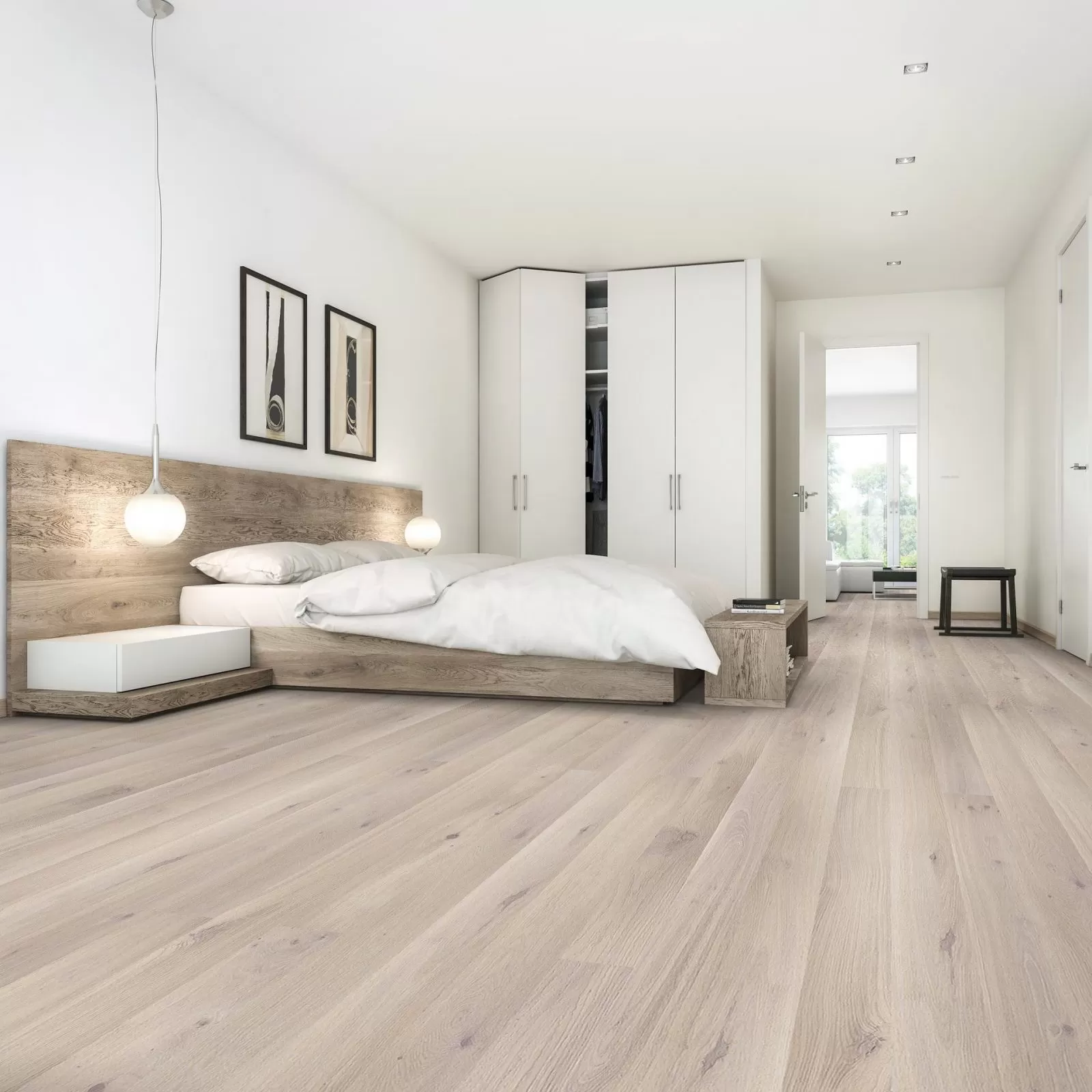 Acest parchet stejar albit triplu stratificat stejar full plank face parte din linia de PROMO Standard de la Barlinek. Modelul de parchet stratificat tip dusumea are o culoare deschisa, cu nuante de crem, bej. Suprafata superioara a lamelei de parchet este acoperita cu mai multe straturi de lac mat crem. Lacul aplicat are rolul de a proteja lamela impotriva uzurii si abraziunii.