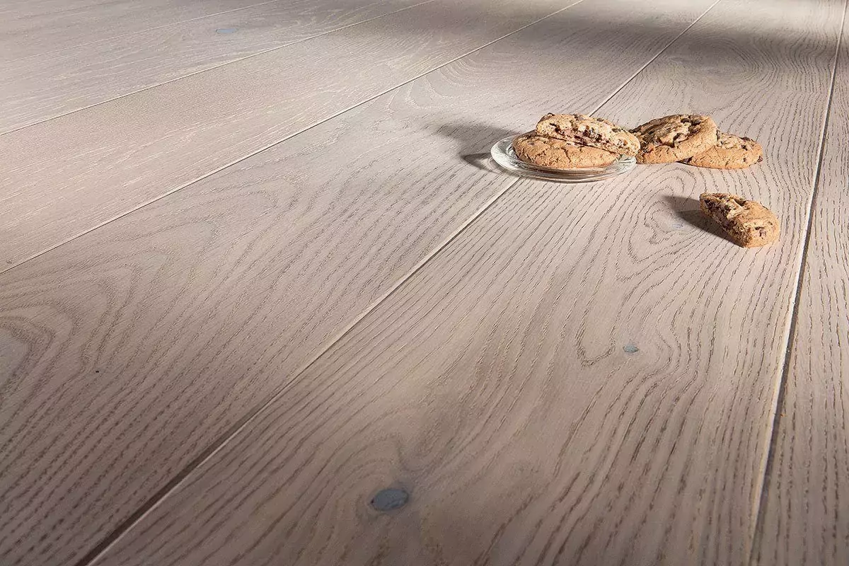 Parchet Barlinek Biscuits Grande din stejar uleiat în nuanţe de alb. Textura lemnului este subliniată prin procedeul de periere. Muchiile parchetului sunt foarte clar evidențiate având toate cele patru laturi teșite.
